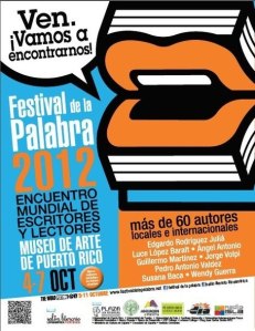 Se aproxima El Festival de la Palabra 2012 al ritmo de un son agitado. Estaremos ahí. San Juan de Puerto Rico. Del 3 al 8 de octubre. Se anuncian 75 autores del país y de otros 20 países. De su entraña surgirá el nombre de quien ganó el Premio Las Américas. Salón Literario Libroamérica organiza: Mayra Santos Febres entre otros. Si quieres saber más, haz clic en la imagen. Festival de la Palabra 2012. Se aproxima a ritmo agitado. Estaremos ahí: llegaremos a puerto, rico los ojos de Puerto Rico. Del 3 al 8 de octubre…